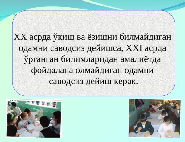 Ҳозирги кунда ўқувчиларда ўқув предметлари бўйича фақатгина билим, кўникма ва малакаларга эга бўлишнинг ўзи етарли эмаслиги маълум бўлмоқда. Жумладан: