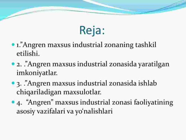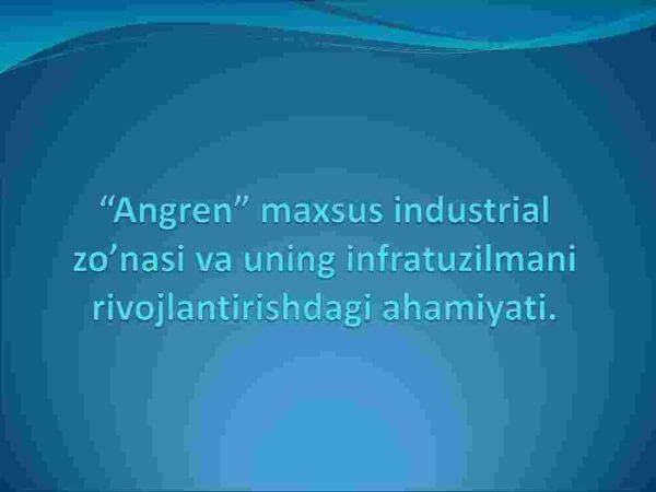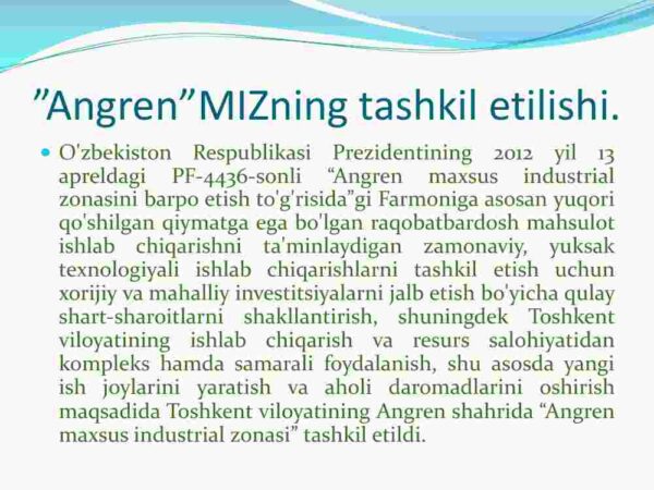 1. Angren maxsus industrial zonaning tashkil etilishi.