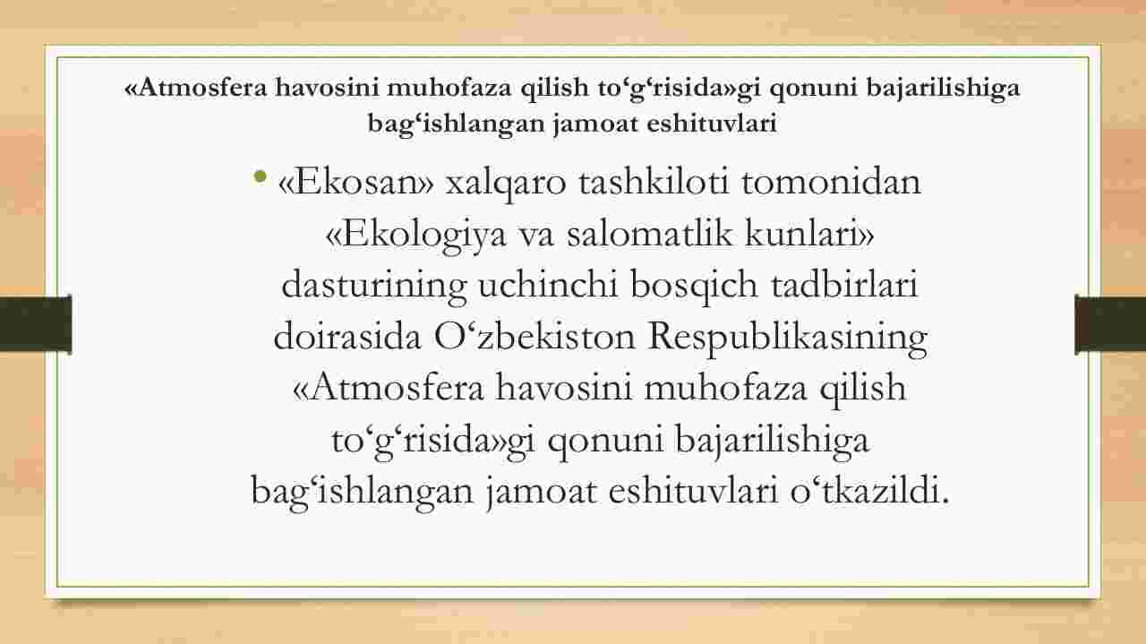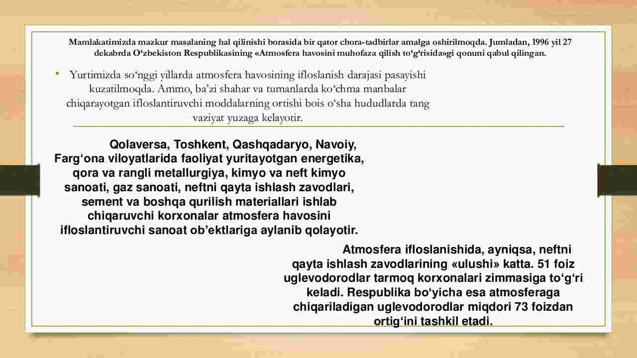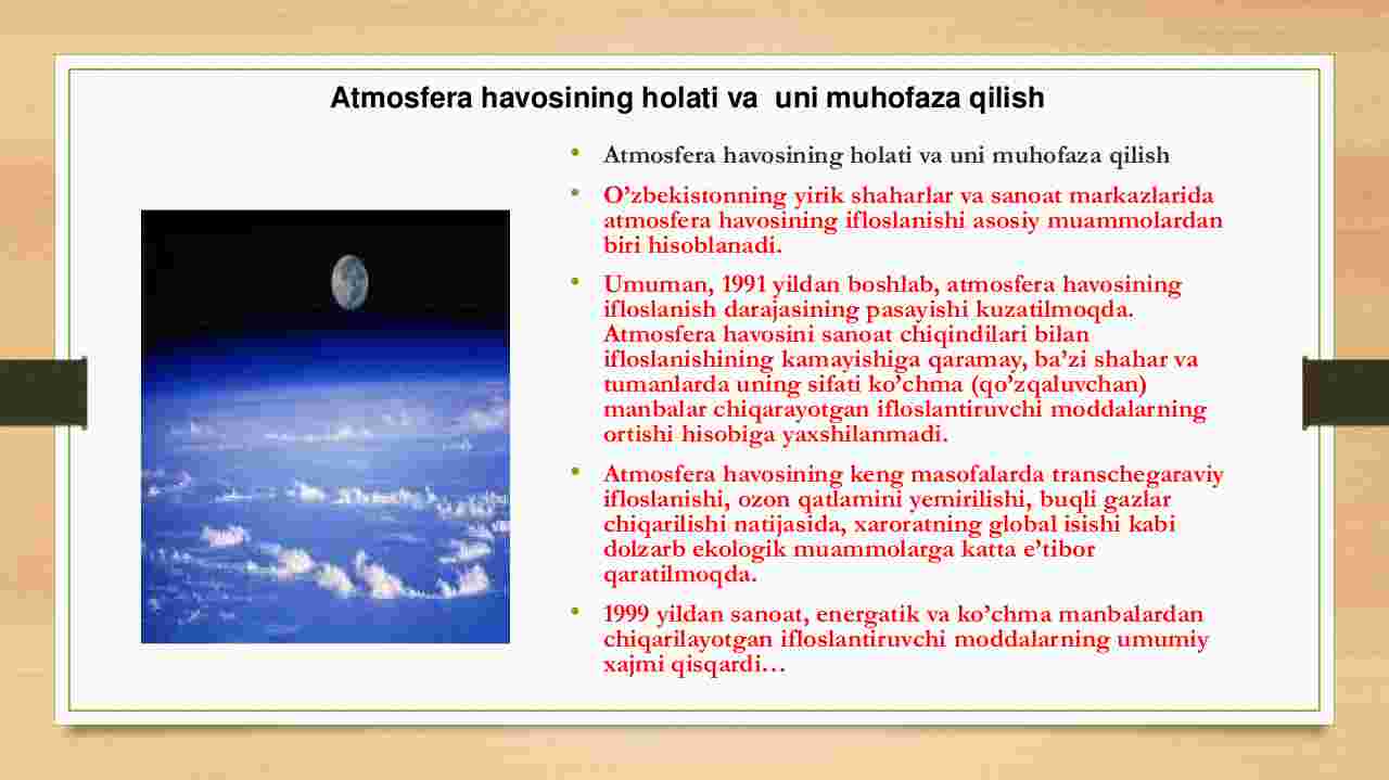 – Atmosfera havosining keng masofalarda transchegaraviy ifloslanishi, ozon qatlamini yemirilishi, buqli gazlar chiqarilishi natijasida, xaroratning global isishi kabi dolzarb ekologik muammolarga katta e’tibor qaratilmoqda.