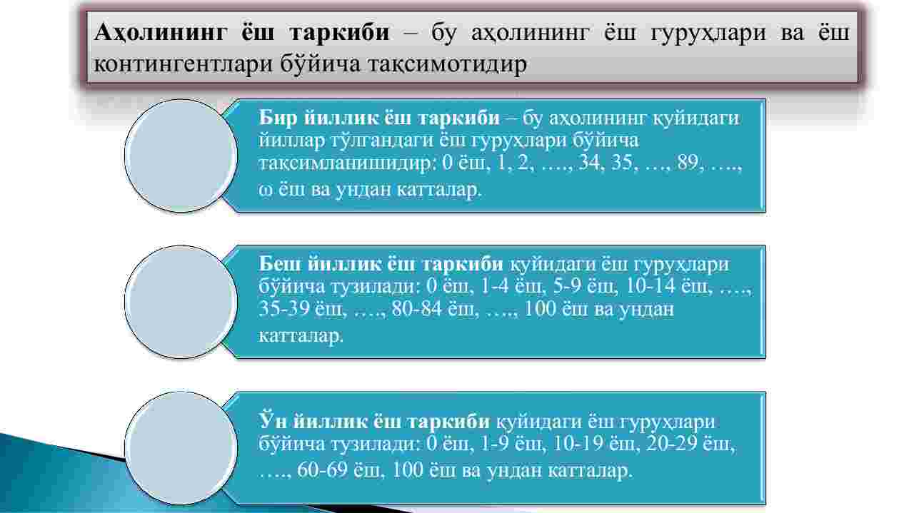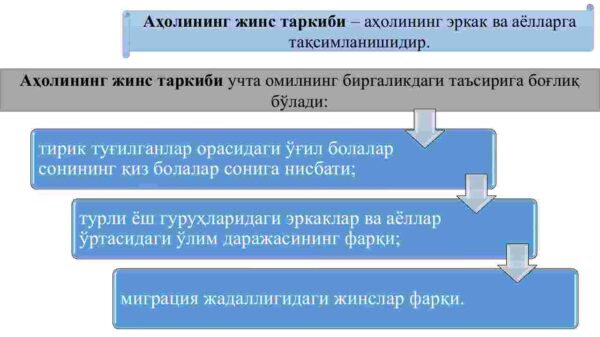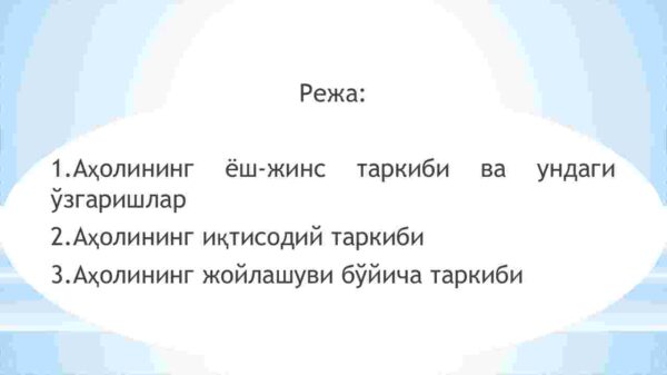 Reja: 1. Aholining yosh-jins tarkibi va undagi o’zgarishlar 2. Aholining iqtisodiy tarkibi 3. Aholining joylashuvi bo’yicha tarkibi