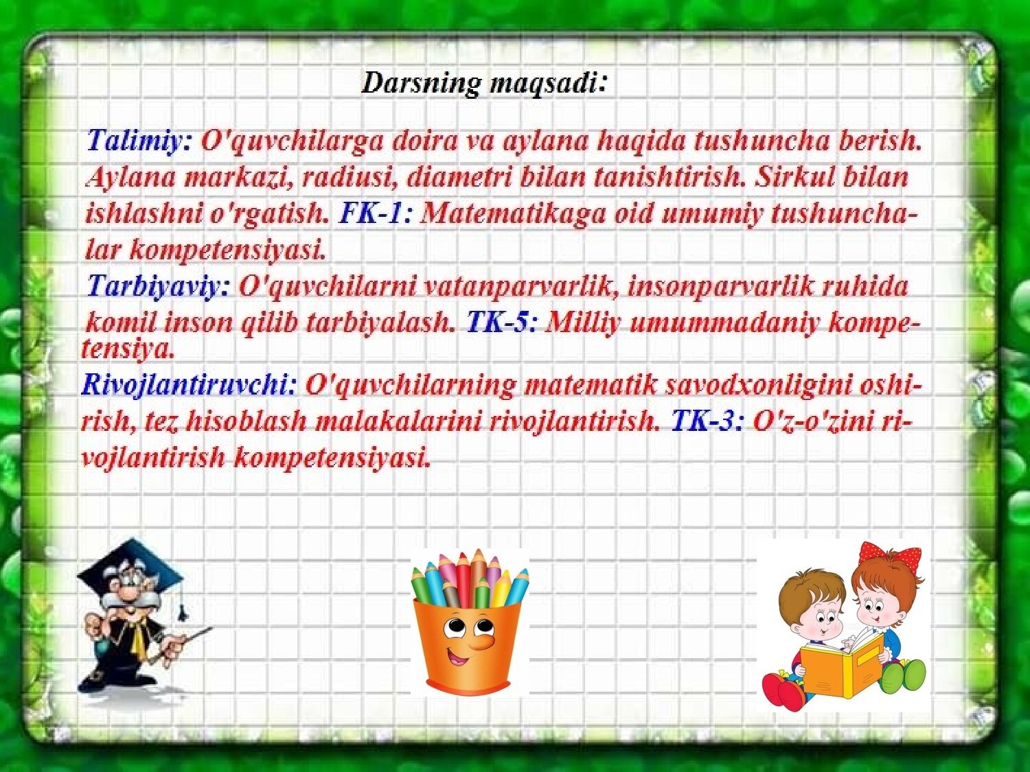 Doira va aylana. Aylana markazi, radiusi va diametri. Misollar