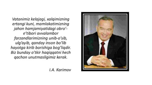 Vatanimiz kelajagi, xalqimizning ertangi kuni, mamlakatimizning jahon hamjamiyatidagi obro’-e’tibori avvalambor farzandlarimizning unib-o’sib, ulg’ayib, qanday inson bo’lib hayotga kirib borishiga bog’liqdir. Biz bunday o’tkir haqiqqatni hech qachon unutmasligimiz kerak.