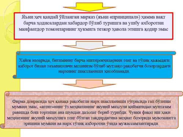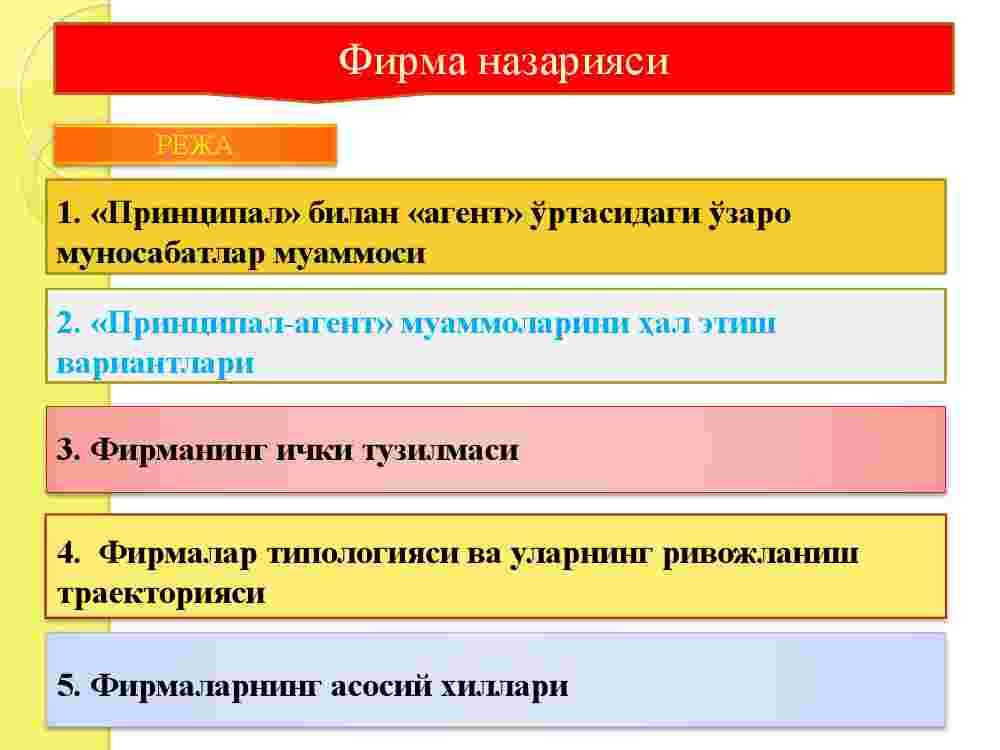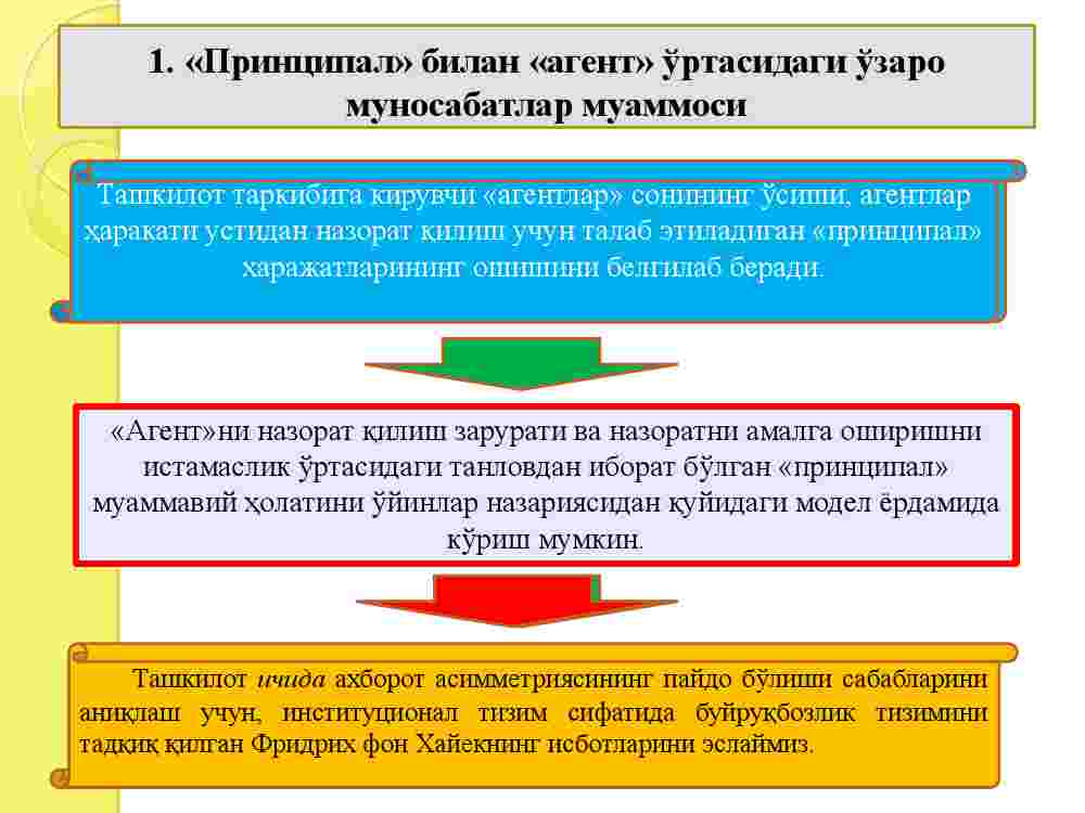 1. «Prinsipal» bilan «agent» o’rtasidagi o’zaro munosabatlar muammosi.