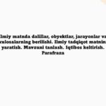 1.Ilmiy matnning asosiy qismlari: dalillar, obyekt, jarayon va xulosa