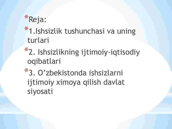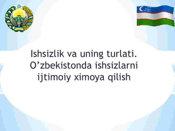 3. O’zbekistonda ishsizlarni ijtimoiy ximoya qilish davlat siyosati.