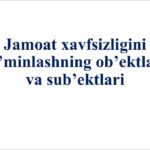 1. Jamoat xavfsizligini ta’minlash shakllari. 2. Jamoat xavfsizligini ta’minlash usullari. 3. Jamoat xavfsizligini ta’minlash rejimi.