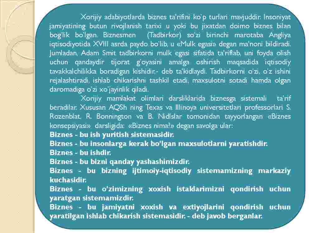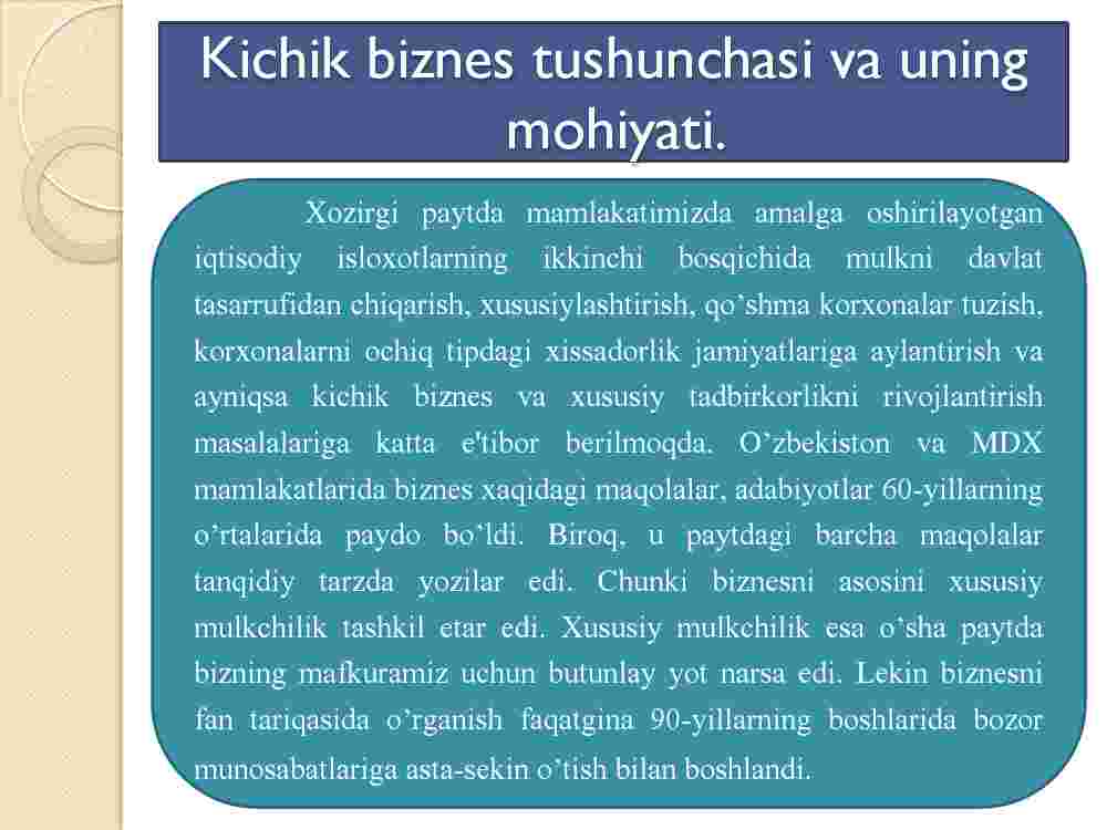 1. Kichik biznes tushunchasi va uning mohiyati.