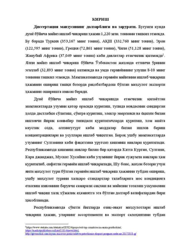 1.2-§. Uzumdan quritilgan mahsulot – mayiz ishlab chiqarishning bugungi ahvoli va rivojlanish istiqbollari