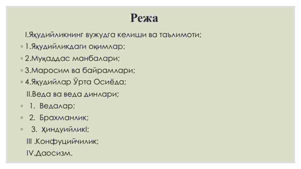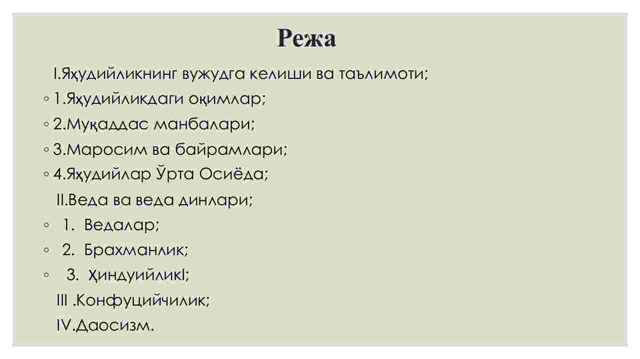 I. Yahudiylikning vujudga kelishi va ta’limoti;