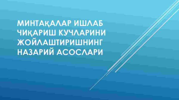 3. Ishlab chiqaruvchi kuchlarni joylashtirish qonuniyatlari: ishlab chiqarishni oqilona joylashtirish, mintaqa xo’jaligini kompleks rivojlantirish, hududiy mehnat taqsimoti.