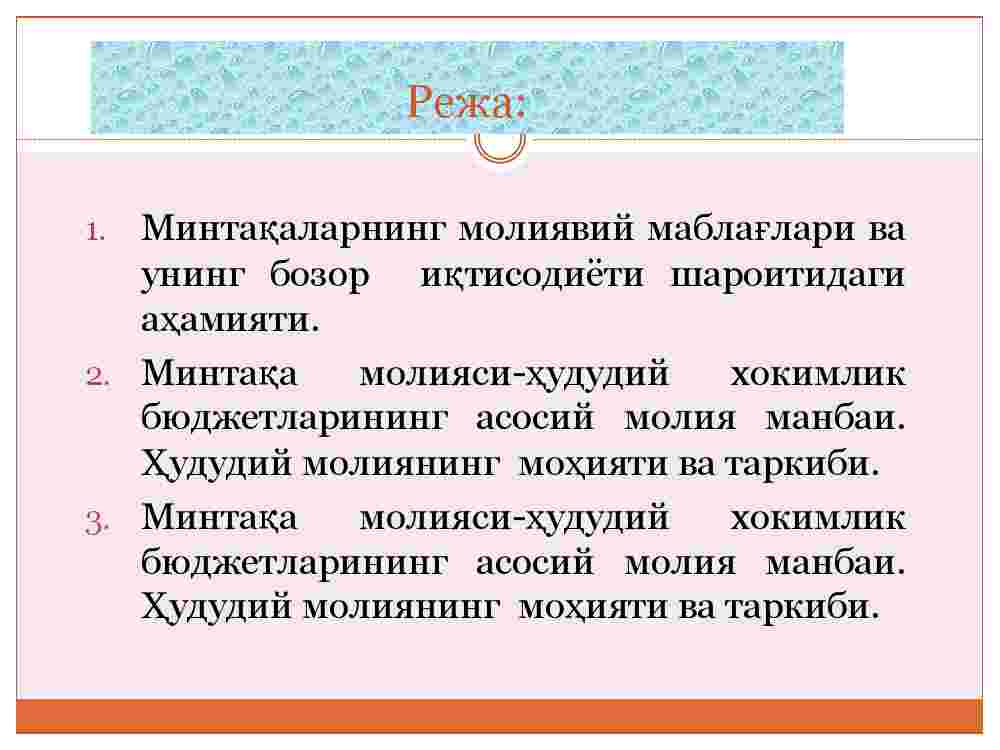 1. Mintaqalarning moliyaviy mablag’lari va uning bozor iqtisodiyoti sharoitidagi ahamiyati.