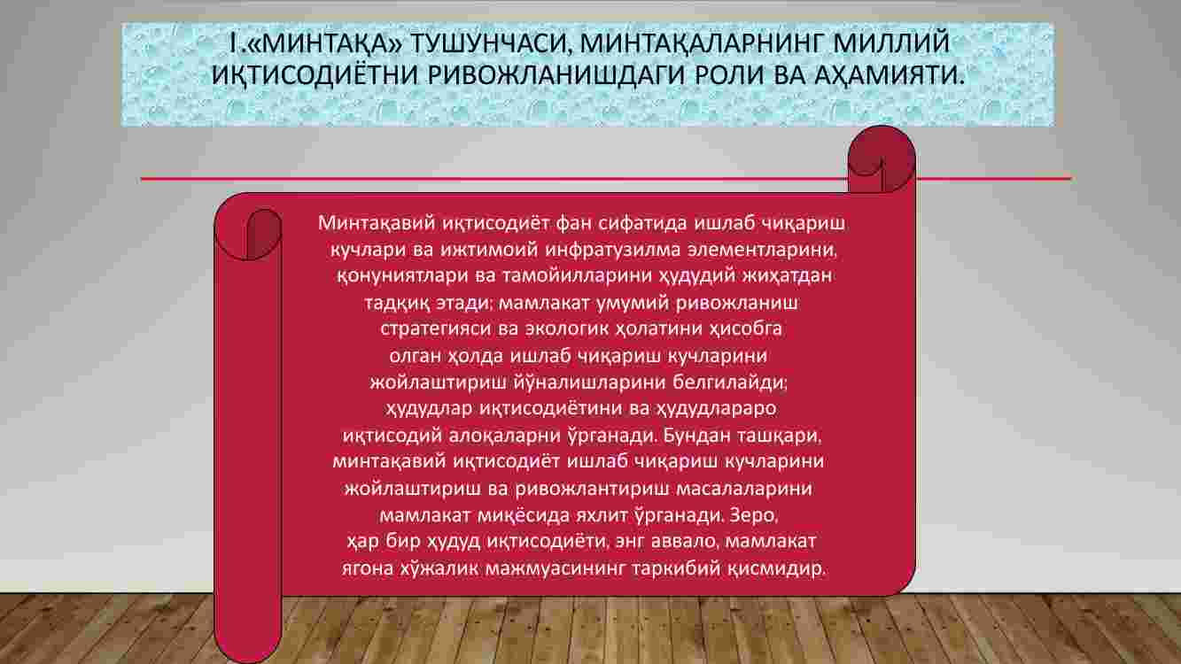 1. «Mintaqa» tushunchasi, mintaqalarning milliy iqtisodiyotni rivojlanishdagi roli va ahamiyati.
