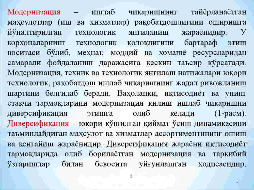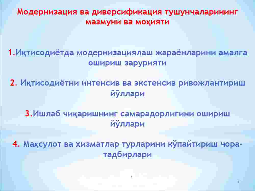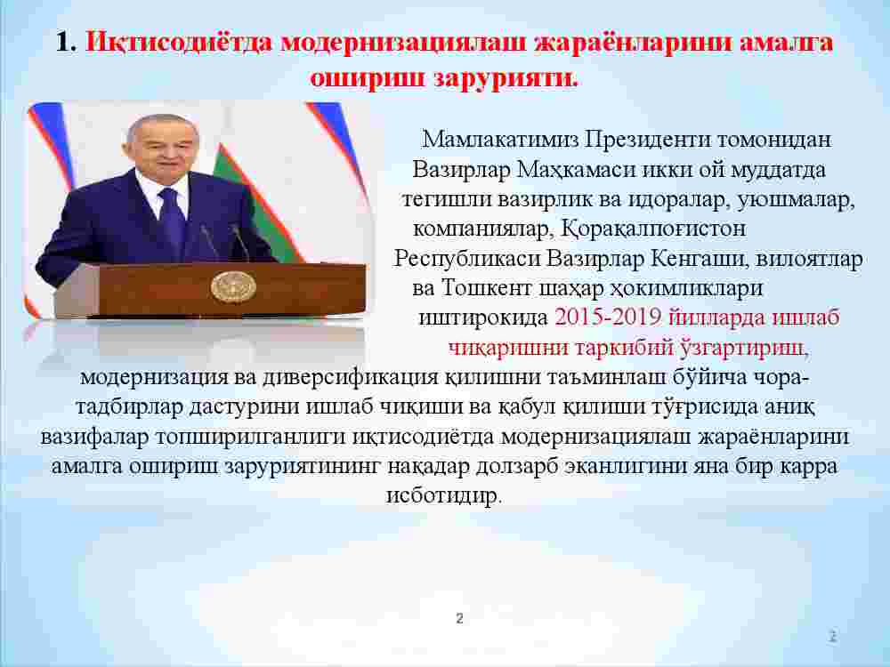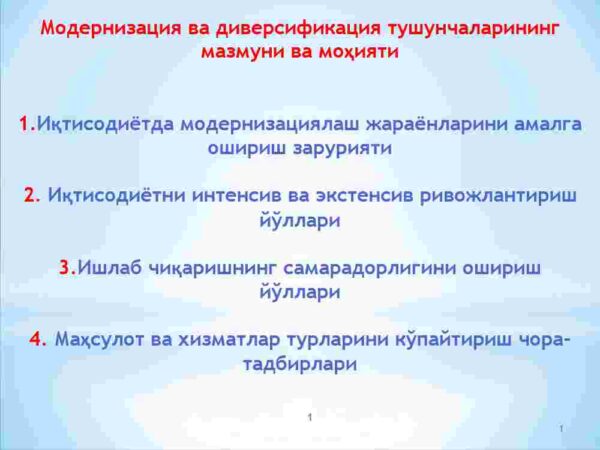 1. Iqtisodiyotda modernizatsiyalash jarayonlarini amalga oshirish zaruriyati.