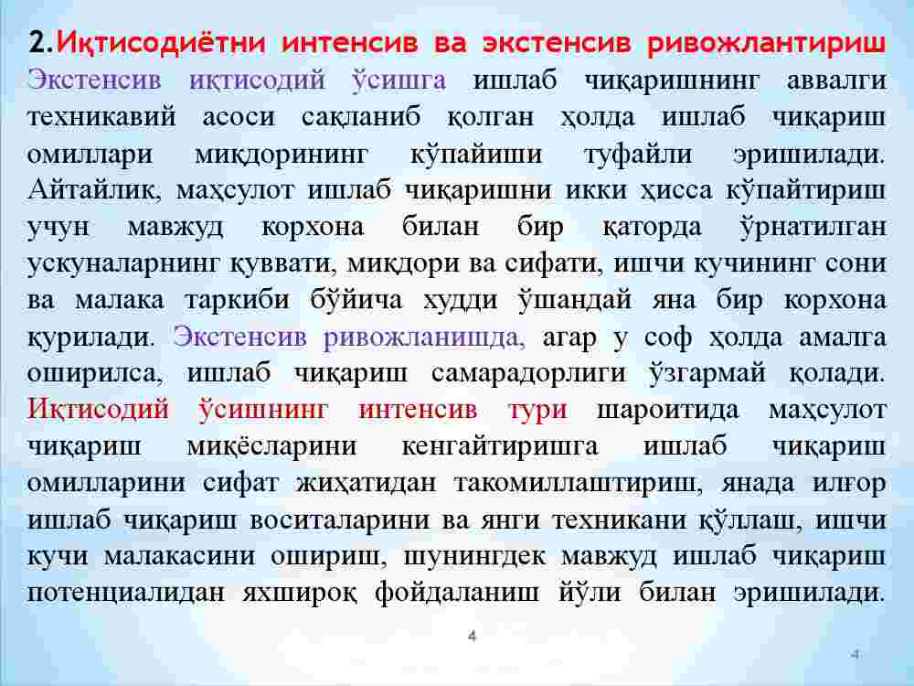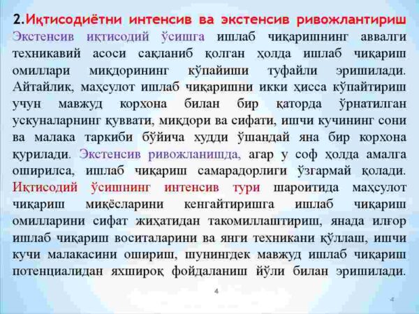 2. Iqtisodiyotni intensiv va ekstensiv rivojlantirish yo’llari.