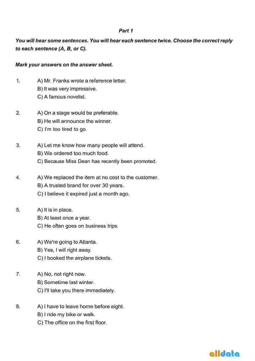 You will hear some sentences. You will hear each sentence twice. Choose the correct reply to each sentence (A, B, or C).