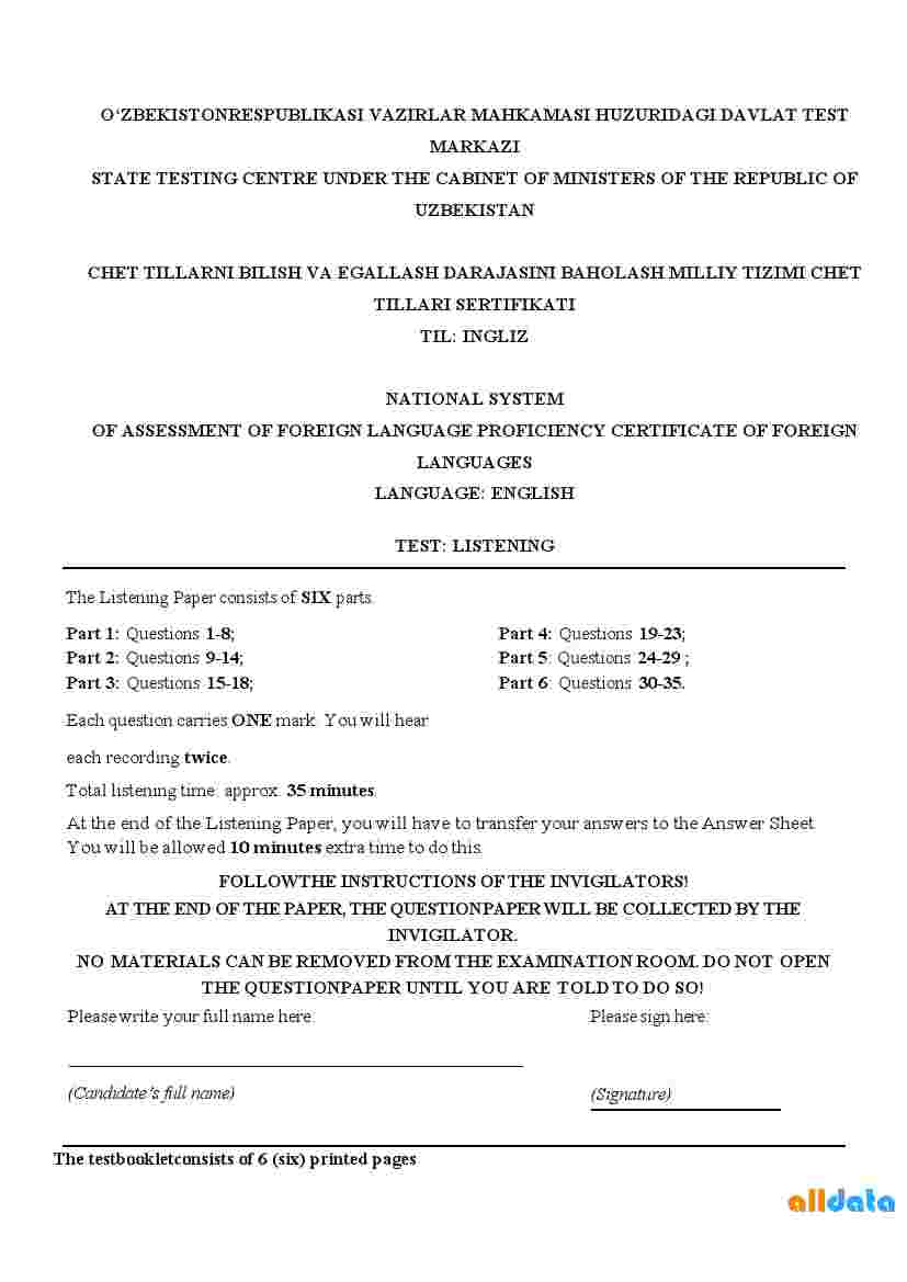 CHET TILLARNI BILISH VA EGALLASH DARAJASINI BAHOLASH MILLIY TIZIMI CHET TILLARI SERTIFIKATI TIL: