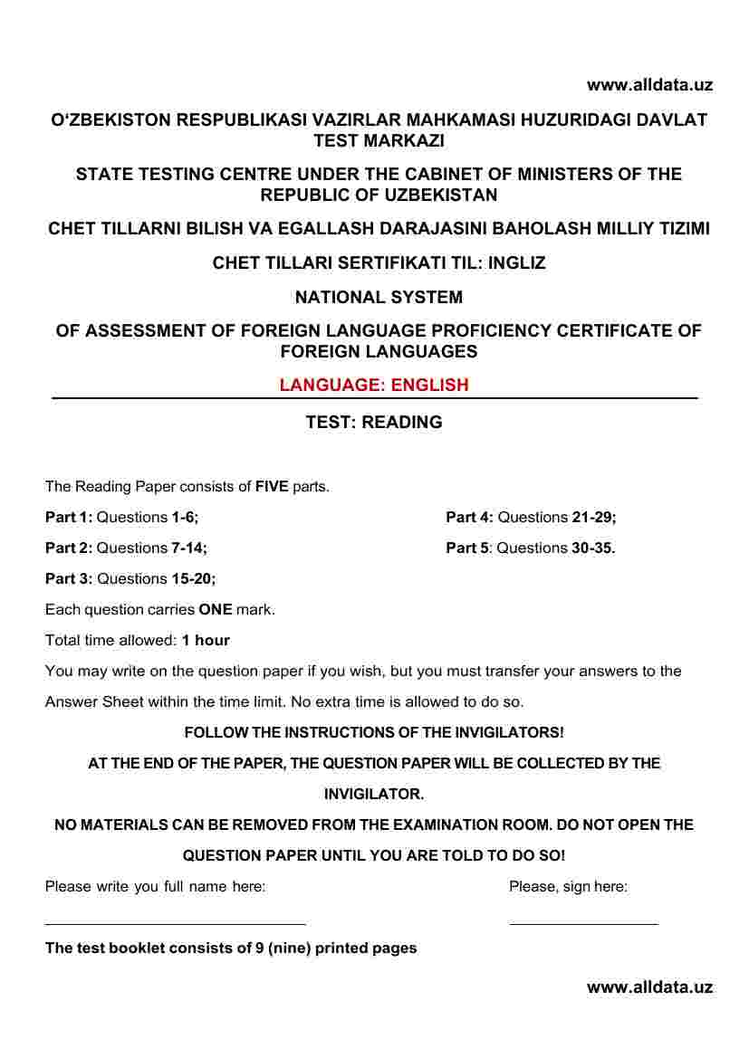 Multilevel Mock testiga tayyorlanish uchun reading test javoblari bilan