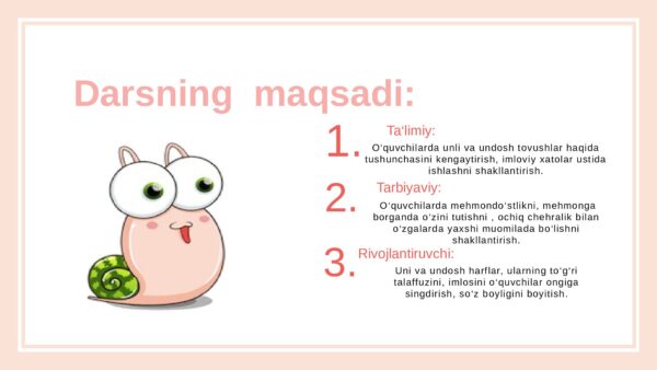 O‘quvchilarda unli va undosh tovushlar haqida tushunchasini kengaytirish, imloviy xatolar ustida ishlashni shakllantirish.