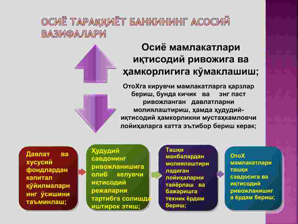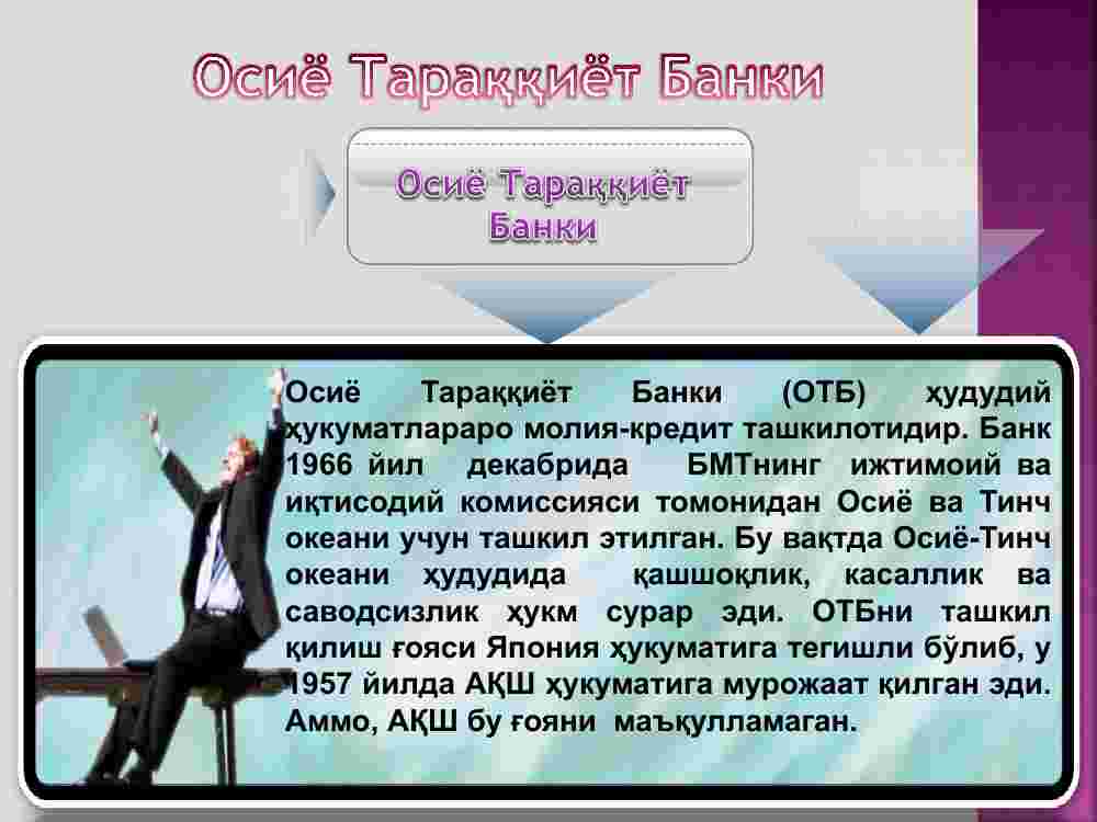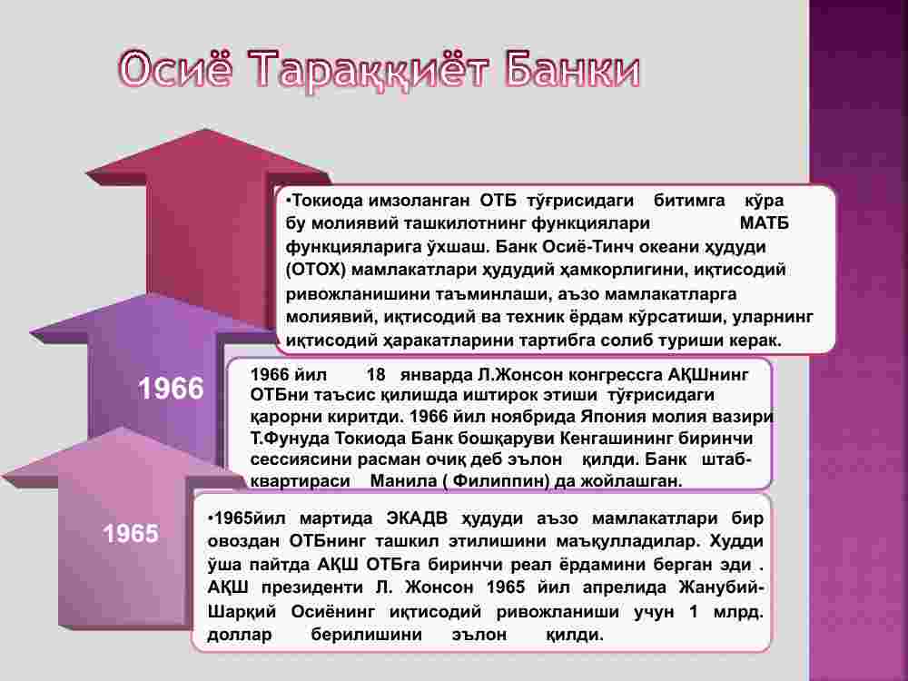 Osiyo Taraqqiyot Banki (OTB) hududiy hukumatlararo moliya-kredit tashkilotidir. Bank 1966 yil dekabrida BMTning ijtimoiy va iqtisodiy komissiyasi tomonidan Osiyo va Tinch okeani uchun tashkil etilgan. Bu vaqtda Osiyo-Tinch okeani hududida qashshoqlik, kasallik va savodsizlik hukm surar edi. OTBni tashkil qilish g‘oyasi Yaponiya hukumatiga tegishli bo‘lib, u 1957 yilda AQSh hukumatiga murojaat qilgan edi. Ammo, AQSh bu g‘oyani ma’qullamagan.