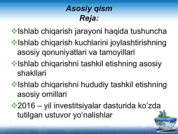 2. Ishlab chiqarish kuchlarini joylashtirishning asosiy qonuniyatlari va tamoyillari.