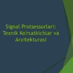 Reja: 1. Signal protsessorlarning asosiy ishlash prinsiplari va tushunchalari. 2. Turli sohalarda signal protsessorlarining qo’llanilishi va afzalliklari. 3. Signal protsessor parametrlari va ularning ishlash samaradorligi.
