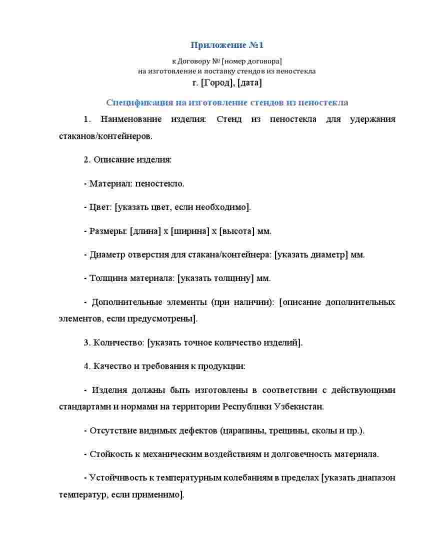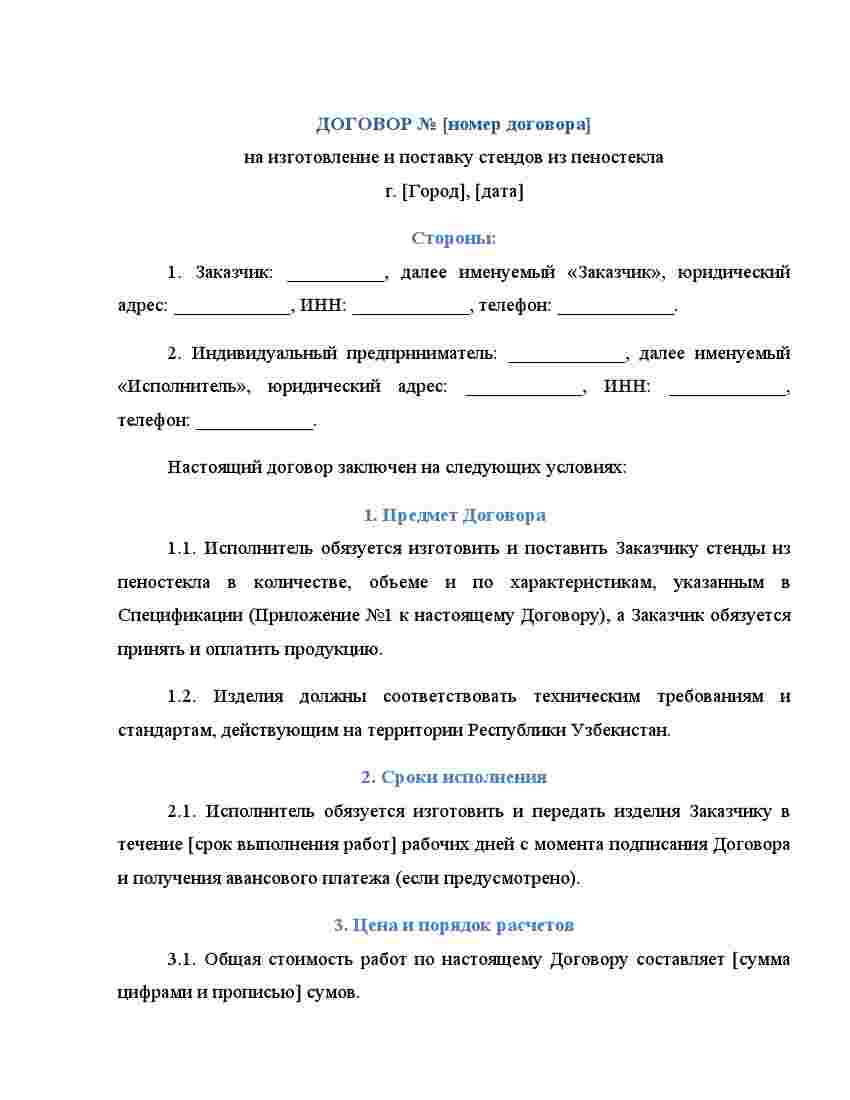 Ushbu hujjat — stend ishlab chiqarish, o‘rnatish va yetkazib berish xizmatlarini amalga oshiruvchi korxonalar bilan buyurtmachi o‘rtasidagi huquqiy munosabatlarni tartibga soluvchi ikki tomonlama shartnoma namunasidir. Shartnomada ish hajmi, muddatlar, to‘lov tartibi, tomonlarning huquq va majburiyatlari hamda javobgarlik masalalari batafsil ko‘rsatilgan.