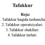 1. Tafakkurning bilish jarayon sifatida 2. Tafakkur turlari va shakllari 3. Nutq haqida tushuncha 4. Nutq turlari 5. Nutqning buzilishi
