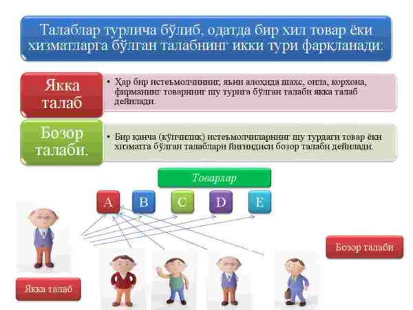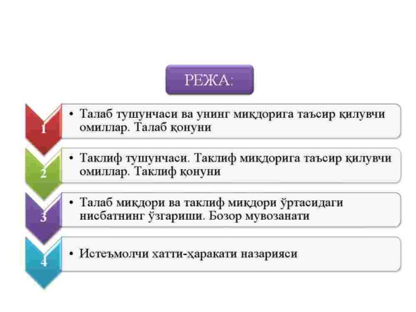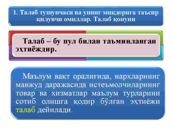1. Talab tushunchasi va uning miqdoriga ta’sir qiluvchi omillar. Talab qonuni.