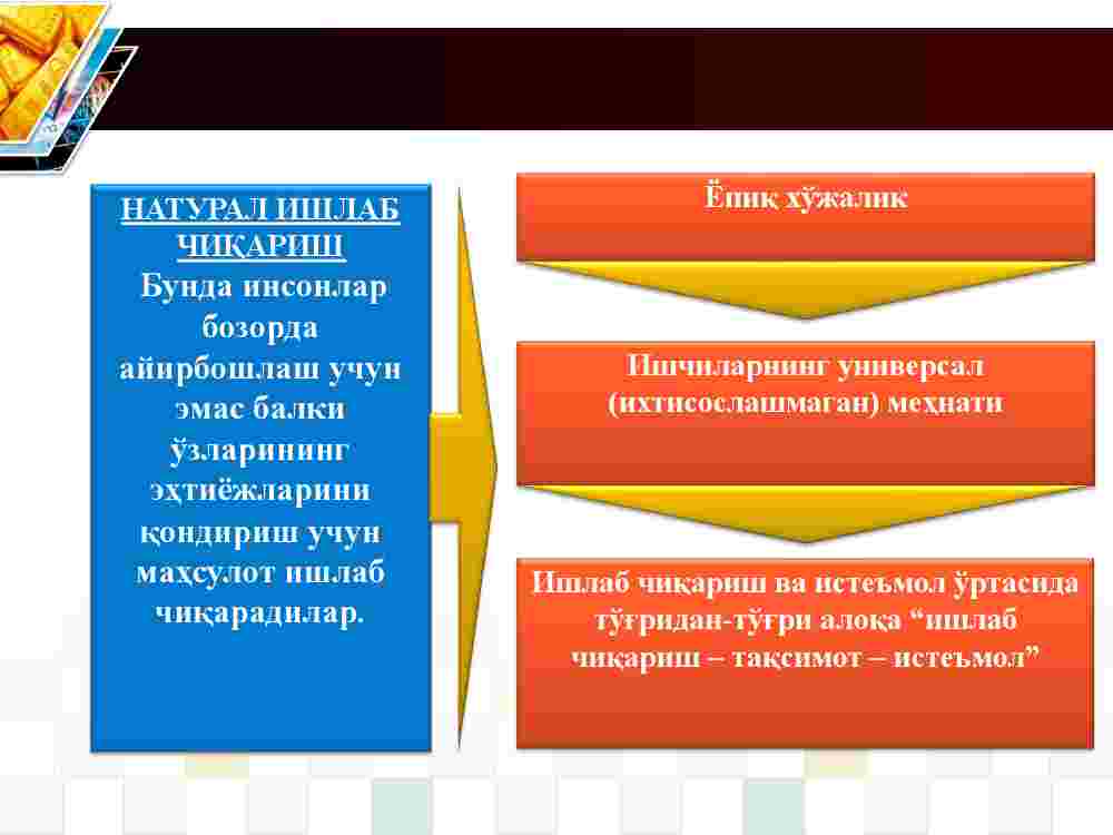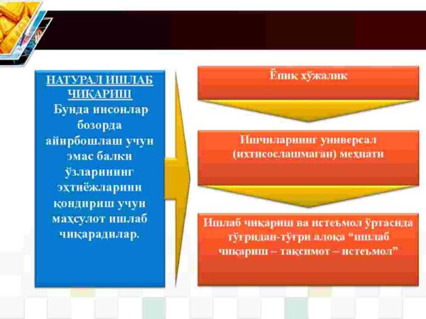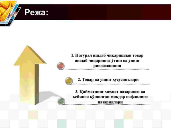 Reja: 1. Natural ishlab chiqarishdan tovar ishlab chiqarishga o’tish va uning rivojlanishi. 2. Tovar va uning xususiyatlari. 3. Qiymatning mehnat nazariyasi va keyingi qo’shilgan miqdor nafliligi nazariyalari.