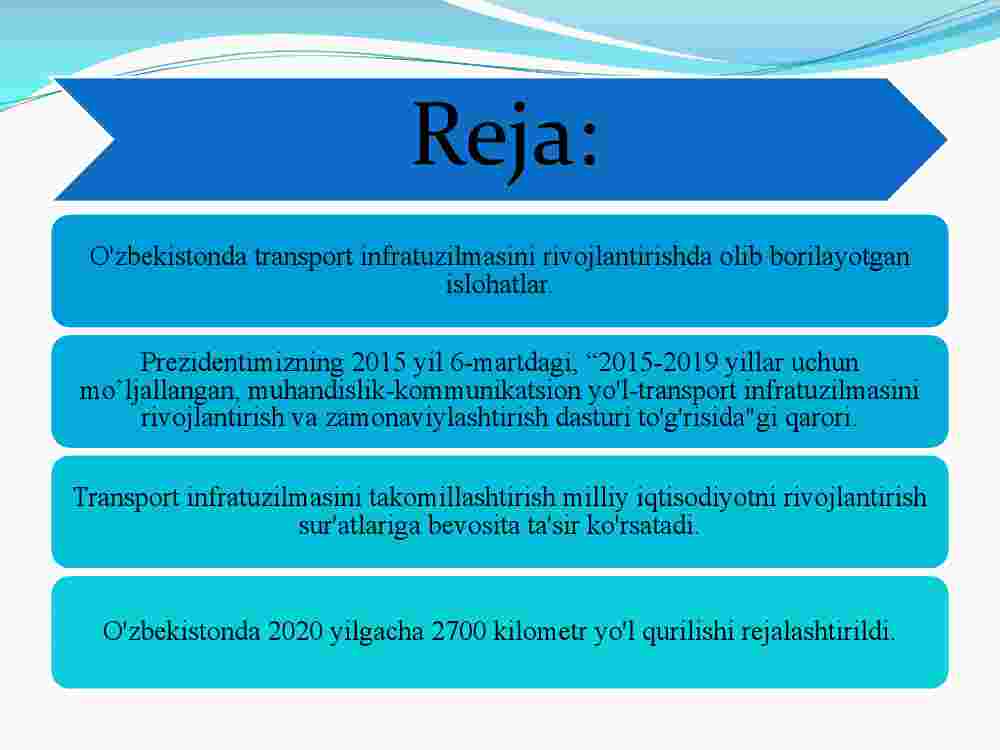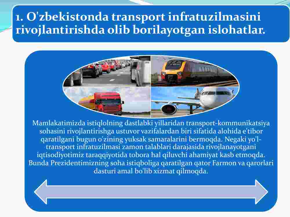 1. O’zbеkistonda transport infratuzilmasini rivojlantirishda olib borilayotgan islohatlar.