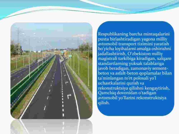 4. O’zbekistonda 2020 yilgacha 2700 kilometr yo’l qurilishi rejalashtirildi.