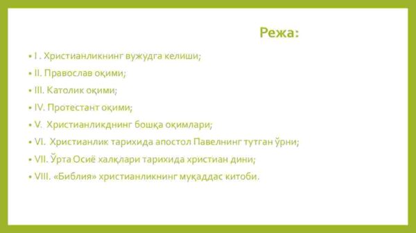 VII. O’rta Osiyo xalqlari tarixida xristian dini;