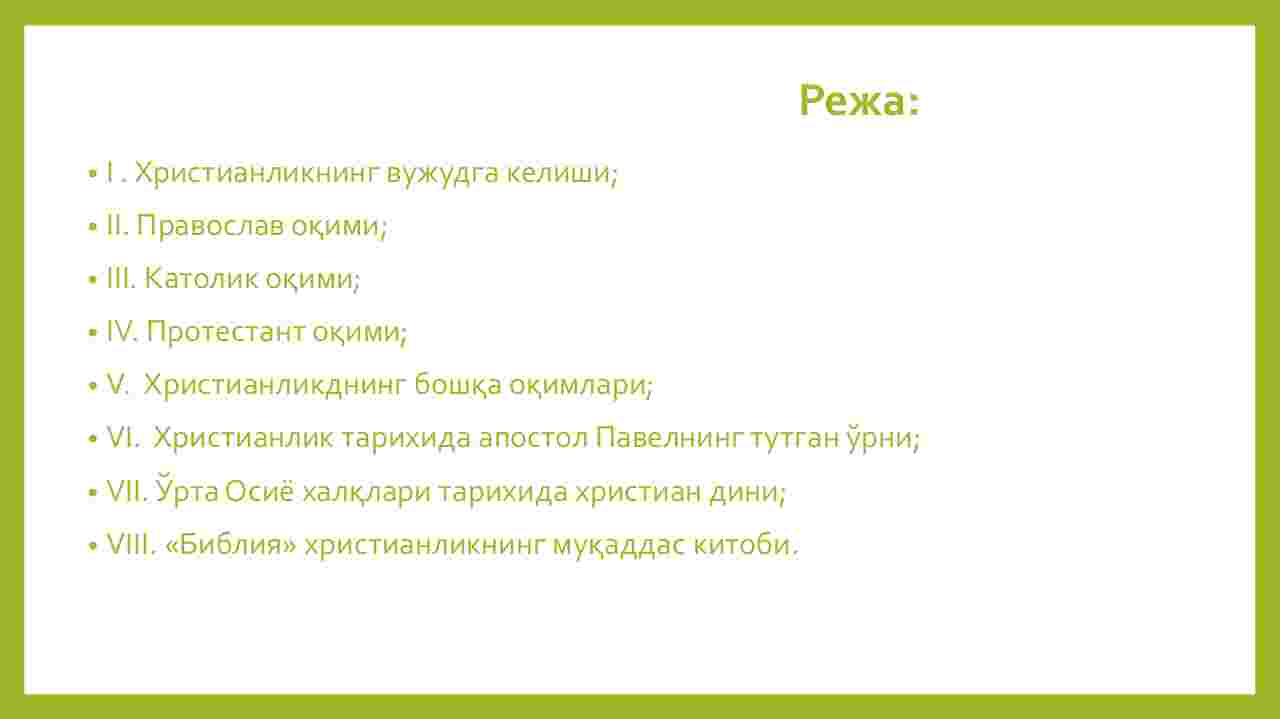 VIII. «Bibliya» xristianlikning muqaddas kitobi.