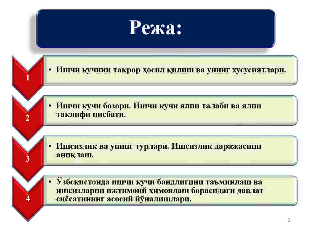 2. Ishchi kuchi bozori. Ishchi kuchi yalpi talabi va yalpi taklifi nisbati.